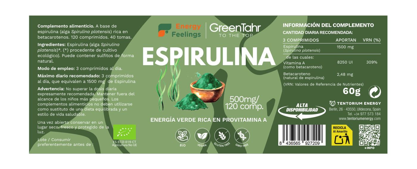 Dosis diaria máxima recomendada: 3 comprimidos al día, que equivalen a 1500 mg de Espirulina