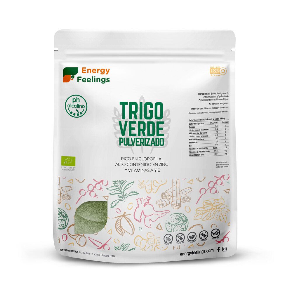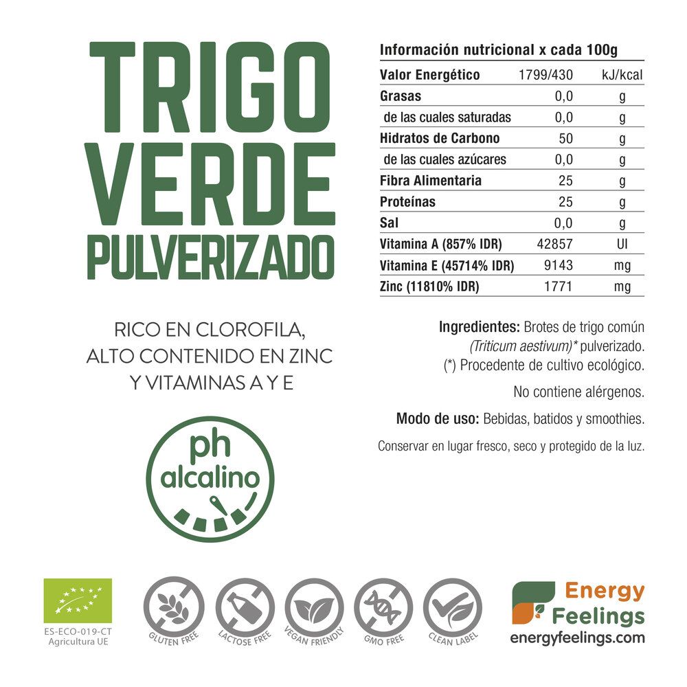 El Trigo Verde Eco Pulverizado es un alimento obtenido a partir de la hierba joven de la planta de trigo (Triticum aestivum), recolectada en su etapa de máximo valor nutricional y procesada hasta obtener un polvo fino y homogéneo. Al proceder de agricultura ecológica, se garantiza un producto libre de organismos modificados genéticamente (no GMO) y no irradiado.