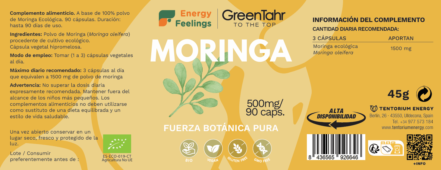 Cápsulas de extracto puro de moringa ecológica, fuente natural de vitaminas, minerales y antioxidantes. Aporta 1.500 mg por dosis diaria. Ideal para reforzar la nutrición diaria en dietas veganas o funcionales